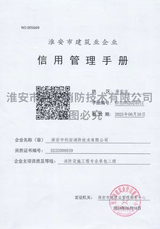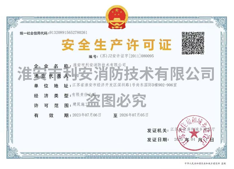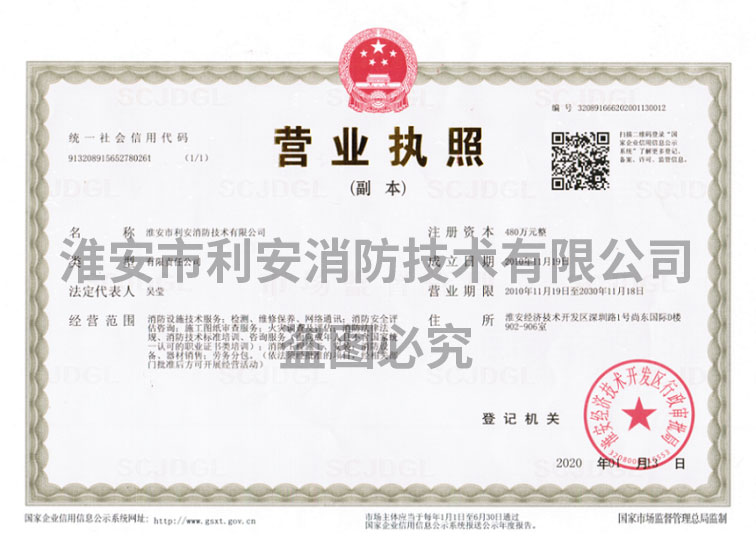 淮安市利安消防技术有限公司成立于二0一0年,目前满足2019年8月29日,应急管理部颁布《消防技术服务机构从业条件》,已在江苏消防网注册备案,可以从事消防设施的检测、维修保养、消防评估,且取得江苏省建委颁发的消防设施工程专业承包贰级资质证书,可从事消防设施安装。
